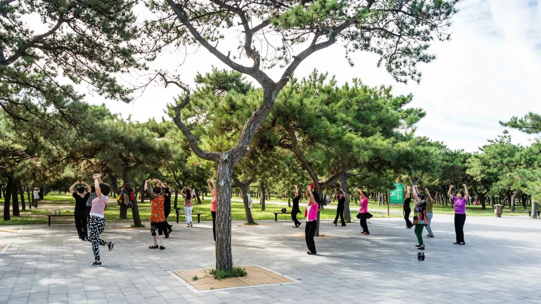 Réveil matinal au Temple du Ciel pour une session de détente tai-chi en tenue locale avec ou sans épée encadrée par un coach, pour les danses avec éventails ou pour observer la calligraphie faite par les locaux sur les dalles à même le sol.